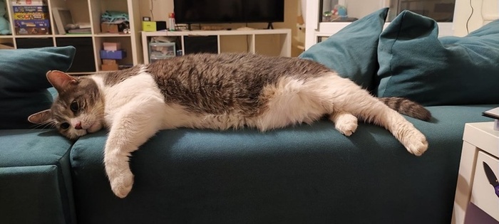 Он поставил себе достойную любого кота цель - полежать на всех пригодных (и не очень) для этого поверхностях в доме, да и в разных позах.