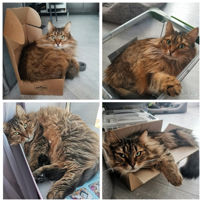 Растаял вреднюга, привык совсем уже, мурчит, на руках сидит уже без недовольства, разрешает целовать морковный нос и почесывать мохнатое пузцо. Но иногда нет-нет, да и поддаст, говорит –меру надо знать! Ещё он у нас Повелитель коробочек – осваивает коробки любого размера!»