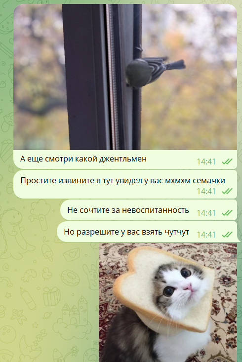 Да. На окне у меня опять кормушка. Если у вас есть котячья/собачья шерсть они тоже ее очень любят забирать! Обожаю птичек. В прошлом году было больше воробьев они очень невоспитанные! Один раз заметила, как воробушек сел на другого чтобы прогнать. За синичками такого не наблюдала!