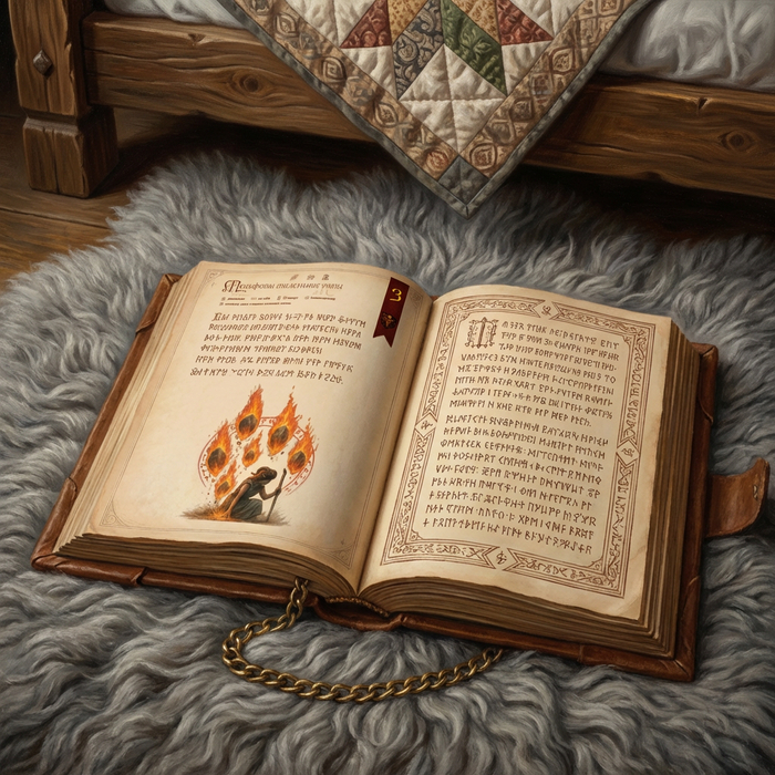 "Meteororum parum Melfa" — одного из самых разрушительных и любимых в арсенале юной волшебницы — было выведено безупречной каллиграфией. Заглавные буквы горели глубоким бордовым цветом, в точности повторяя фон фамильного герба Тэрейа. В верхнем углу пергамента красовалась вычурная лента с золотым символом магического круга, а нижняя часть листа была испещрена детальными схемами движения магических потоков и изящными иллюстрациями огненных сфер. Это хобби — кропотливое украшение своих записей — было редкой отдушиной для девушки, чье детство прошло за бесконечными учебниками и магическими пассами под строгим надзором матери Криеллы и бабушки Хеллги.