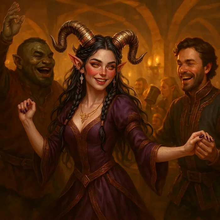 Она была по-настоящему красива: высокая, стройная, с кожей цвета бледного заката и янтарными глазами. Её массивные рога гордо несли на себе семейную реликвию — золотые кольца с гравировкой «Ignipotens Sollers» и «Ardor Incolumis». Черные волосы, собранные в пышную косу, отливали сталью на свету.