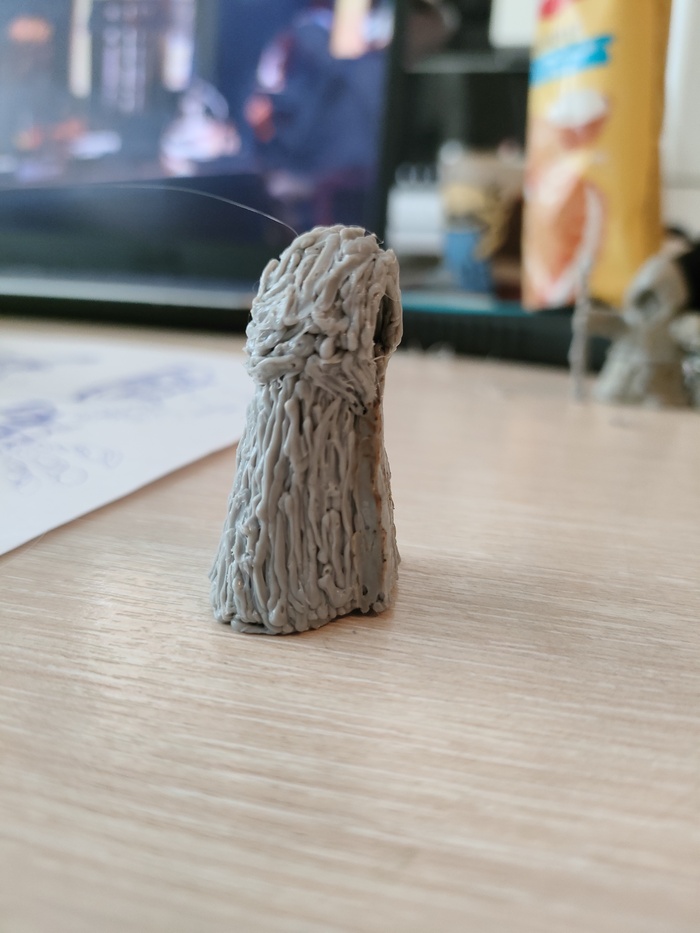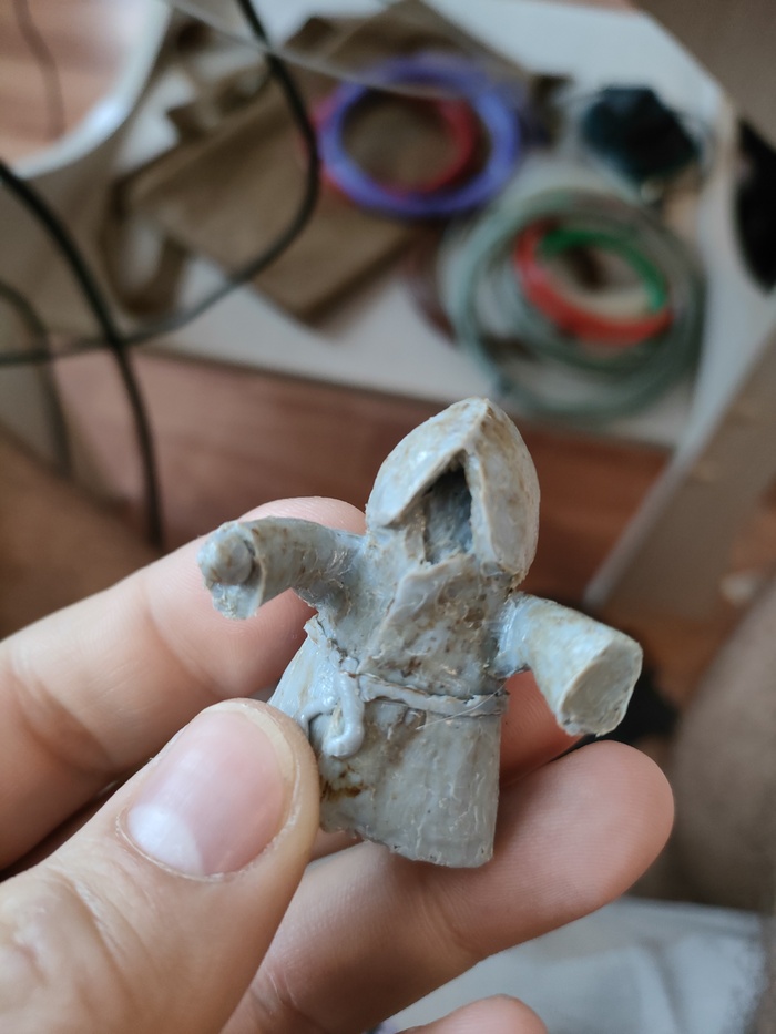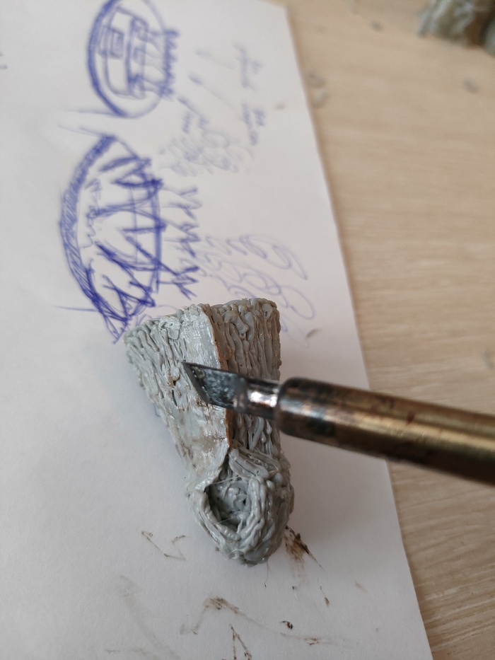 Дальше ручку откладываем в сторону и берём выжигатель. У меня стоит температура 300°, при ней конкретно этот пластик ведёт себя адекватно, если воздействовать короткое время. Один минус - частицы, остающиеся на жале, начинают со временем подгорать и чернеют. Потом они смешиваются с пластиком на модели и получается грязный вид. В данном проекте это скорее плюс, но как избавиться от этого эффекта, я пока не придумал. Вытирать жало не помогает, весь нагар не удаляется.
