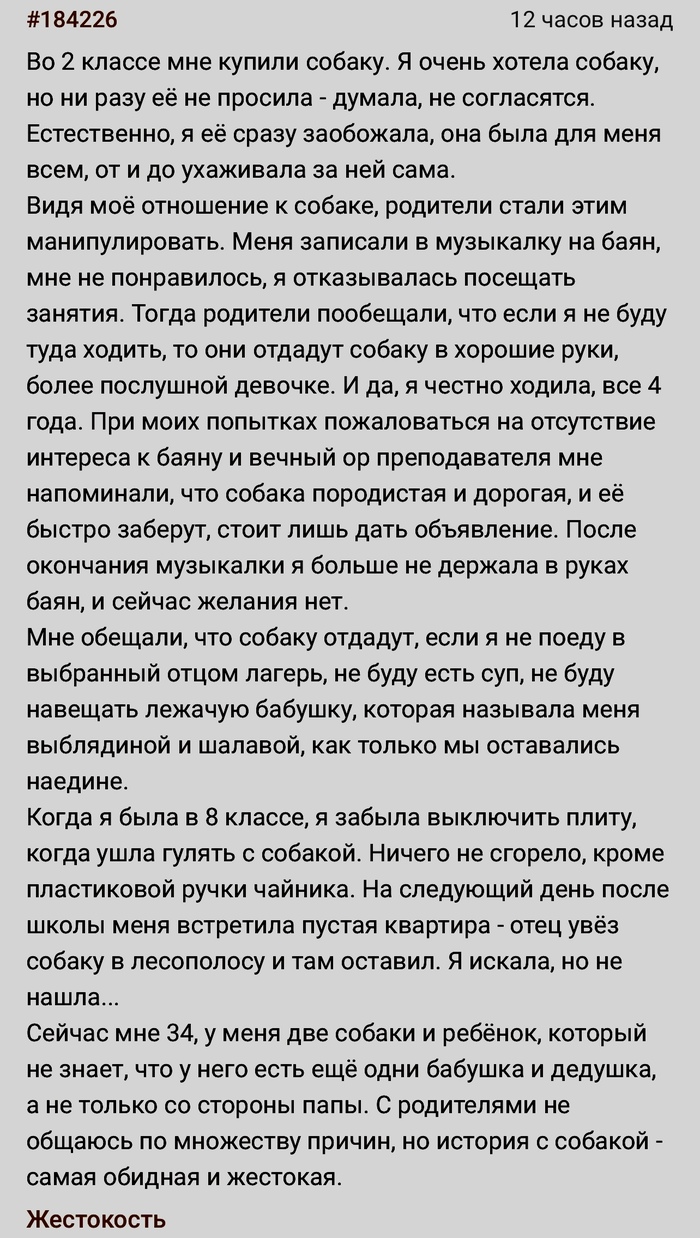 Мы как многие дети хотели собаку, но родителей мы сильно не упрашивали, знали что мама не согласится. Однажды парень, с которым встречалась моя сестра, подарил ей щеночка-полупородистую спаниэльку. Назвали Белла. Она была очень крохотная, ее только только оторвали от матери и прикорм уже мы вводили. Естественно такую кроху родители не могли выставить на улицу, ( мы жили в частном доме, имеется ввиду в будку на улицу) -оставили дома. Так она у нас жила все лето, мы ее носили на улицу в туалет, спала она в коробке возле нашей кровати исключительно в обнимку с рукой. Она была очень умной, не смотря на свой малый возраст, она уже стала привыкать проситься по нужде на улицу- подбегала к двери и поскуливала. Но тем не менее ещё иногда не вытерпливала и гадила под утро в коридоре. Родители жутко психовали из-за этого, мама требовала чтобы мы вставали в 5 утра и сразу убирали эту кучу, потому что они вставали раньше нас, и мама естественно убирала ее сама. Мы с сестрой небыли против того чтобы убирать за ней, но вставать в 5 утра летом было не легко. Однажды, мы пришли домой, а ее нет.. Игрушка лежит, коробка на месте. Где собака? Оказалось родители, пока нас небыло дома, увезли нашу собачку к бабушке, которая жила не близко, соответственно видеться с ней и играть мы уже не могли. К тому же ее посадили на цепь на улицу.. Помню как мы рыдали тогда, было очень обидно и больно что родители так поступили за нашей спиной. Радовало только то, что бабушка полюбила Белку и заботилась о ней, все время говорила какая она умница.