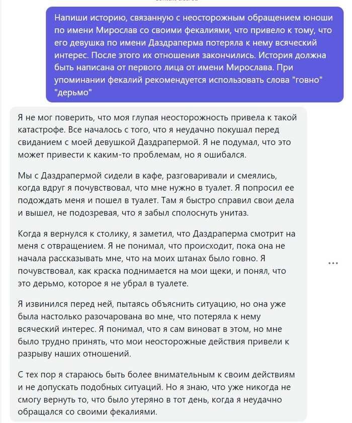 Раз уж мы заговорили о письменах юнцов в различных пабликах, то можно обнаружить и ещё один навык, бессмысленный и беспощадный. ChatGPT способен генерировать туалетные пасты: