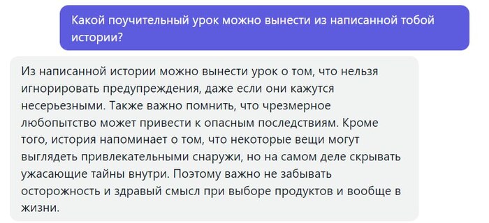 Помимо этого, не чуждо боту и понятие "поучительность", и вот какую мораль он вывел из истории, которую сам написал: