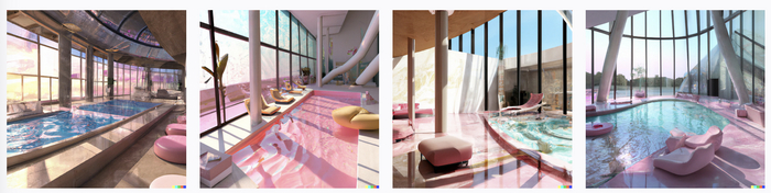 Вот тут я очень конкретно просила два бассейна, один с розовой водой - другой с обычной. Причем сама нейросетка же описание и сделала, и не смогла по своему описанию нарисовать, бассейн везде один: