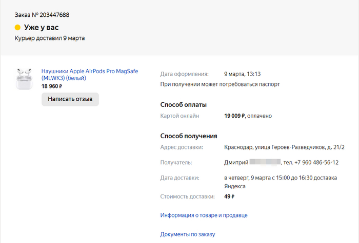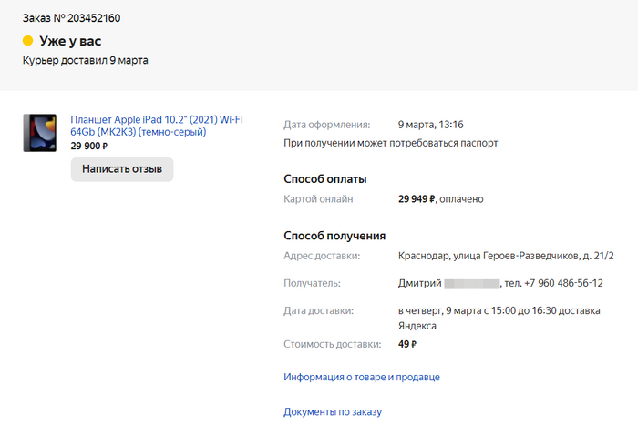 Параллельно этому захожу на Яндекс Маркет и вижу десятки заказов на различные суммы и что доставка курьером в городе Краснодаре, на неизвестный адрес, на неизвестный номер, но мои имя и фамилия.