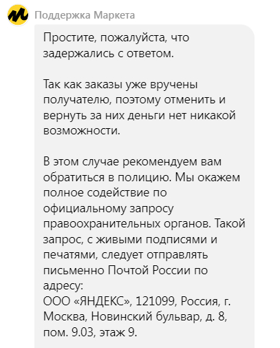 Через 30 минут(после блокировки счета) я позвонил с незнакомого номера на номер, который указан в заказе, представившись курьером яндекс маркета. Человек сказал, что по этому адресу работает и на улице рядом около садика выйдет и получит заказы. Также из разговора узнал, что у него очень много заказов(не только от меня). Затем он перезванивал мне с десяток раз, причем я уже в полиции сидел в это время, говорил что ждёт у садика и не видит меня(на фоне действительно дети орали в садике). Говорил полицейским, почему нельзя наряд вызывать и его на месте там же забрать? Или в штатке подойти, чтобы не спугнуть, на что ответили что все это очень сложно и невозможно так быстро. Также позвонил в полицию краснодара и сказал что такой-то человек получает заказы от разных людей по такому-то адресу(адрес он сам сказал где ждёт курьеров) и прочие данные, какие спрашивали.