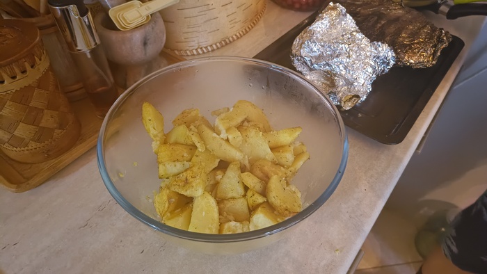 Картошка в фольге - порезать дольками, растительное масло, соль, паприка, хмели-сунели, прованские травы