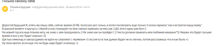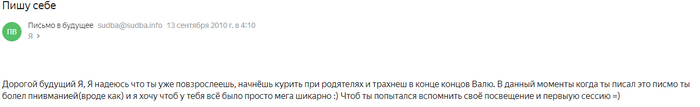 Так что, если вы когда-либо думали об отправке письма себе в будущее, я настоятельно рекомендую вам это сделать. Возможно, через несколько лет вы также получите такой же драгоценный подарок от прошлого, как и я. Это позволит вам вспомнить, кем вы были, посмотреть на свои достижения и ошибки и, возможно, переосмыслить свое будущее.