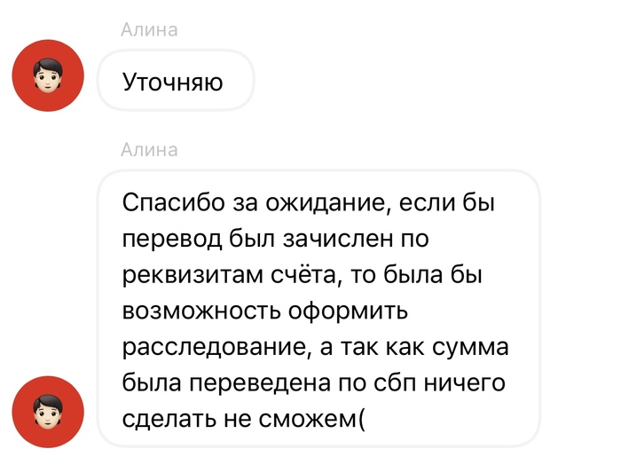 Через 5 мин снова звонок от этой же девушки, на этот раз она сказала, что банк технически не может перевести деньги с моего счета на счет отправителя в Тинькофф банк, так как это перевод по СБП и предложила мне завтра, в удобное для меня время, подойти в любое отделение, где я совершу перевод обратно отправителю со своего телефона, а мне будет выдана бумага от банка, где будет написано, что данный перевод это возврат ошибочного, а не просто перевод. Спросила, во сколько я планирую прийти, чтобы принять без очереди и всё подготовить, дабы не тратить моё время. Так же сказала, что мне оплатят такси до отделения и обратно. Я согласился, сказал что ориентировочно к 11:00 буду в том же отделении, где и был, за такси поблагодарил, но отказался. И на вопрос девушки, есть ли замечания, я рассказал, как меня обслужили, ответ был: обращение принято, меры примем.