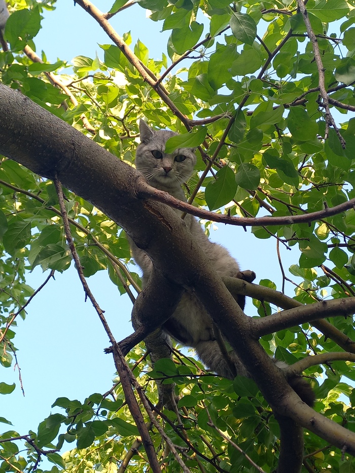 Это соседский кот загнал нашего Поршика на яблоню и сидел как у себя дома, а когда я пришла фотографировать,делал вид,что это не он вообще)