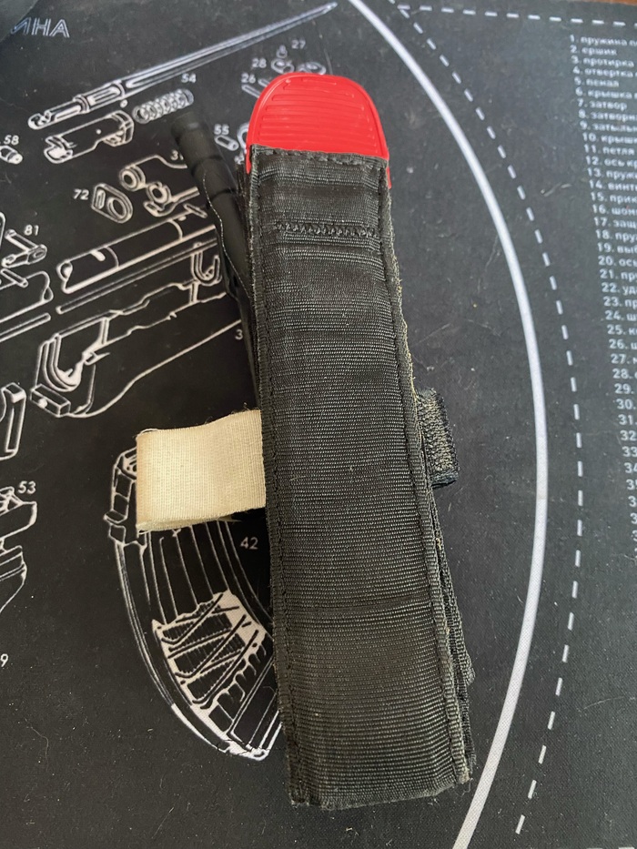 Кончик жгута, сложенного таким образом, должен торчать из аптечки или из подсумка на бронежилете или из-под его лямки. Таким образом закрепленный жгут выдергивается в одно движение и готов к работе сразу же.
