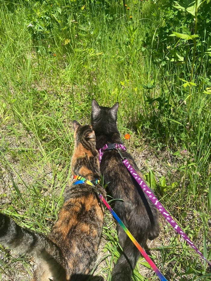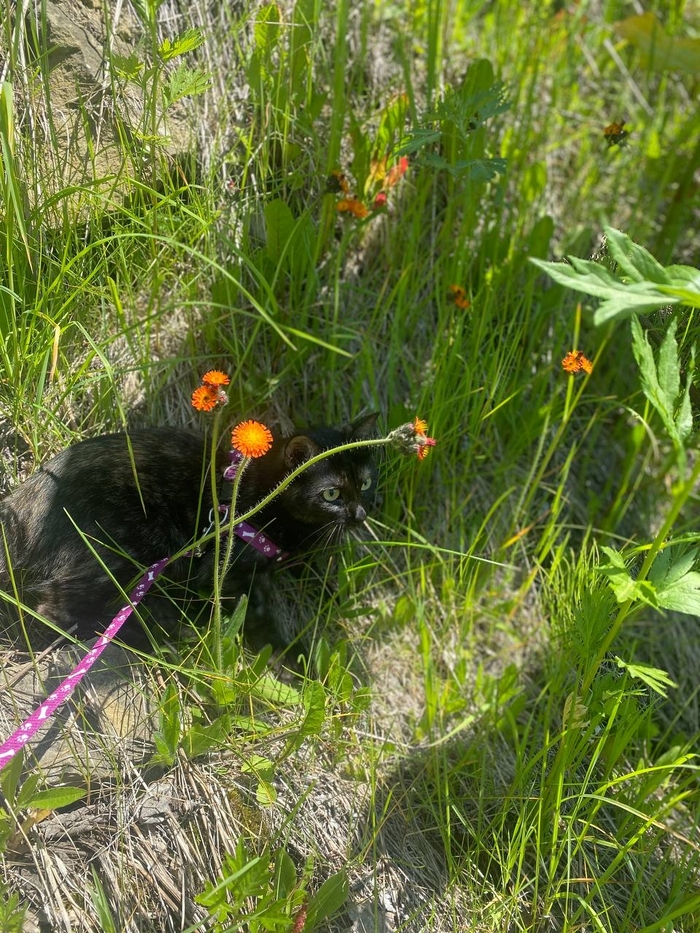 В саду Матрин прекрасно освоился, всё изучил, нашел кусты, где обычно старшие котики лежат в тени, оценил вольер. Чувствует себя комфортно)