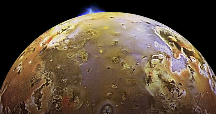 Это необычное явление запечатлено космическим зондом Галилео на Ио – спутнике Юпитера. Ио имеет наибольшую вулканическую активность среди всех тел солнечной системы, на её поверхности насчитали более 400 действующих вулканов. Это обусловлено близостью Ио к Юпитеру и её сильно вытянутой орбитой, в связи с чем возникает сильное приливное трение в недрах спутника и, как следствие, их разогрев.