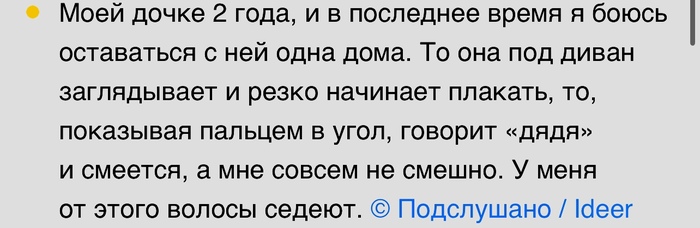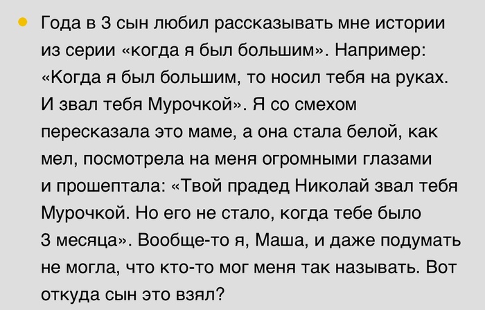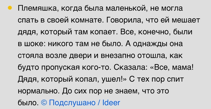 Почему-то тогда отнеслись к этому как "ну, постучали, мало ли что где брякнуло". А через день, маме позвонили и сказали, что её бывший муж, отец моего брата, умер ровно в тот день, когда нам стучали в окно.