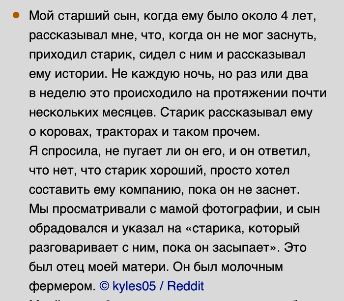 Ну и бонусом история, мой покойный дедуля, за пару дней до смерти видел как кто-то к нему приходил. Дед уже не вставал, у него был неоперабельный рак, поэтому всегда лежал на своей кровати, напротив дверного прохода, который выходил в коридор, прямо на входную дверь.