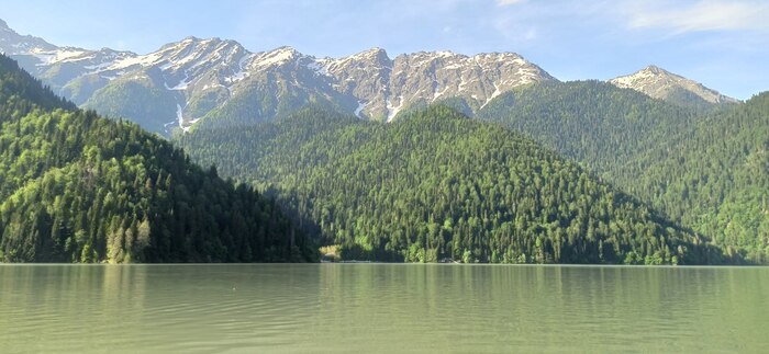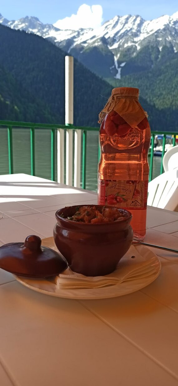 Обедать привезли на озеро Рица, абсолютно несъедрбное картофельное пюре с такой же мерзкой котлеткой- 400руб. Заказали еще нарезки огурец/помидор по 150гр/250руб - две и вина по 100гр/2стакана - итог 3500руб. Вино кинули на стол, оно пролилось и конечно никто не убрал и даже салфеток на столе я не обнаружила. Зато к счету добавили 350руб за обслуживание, о котором не предупреждали. Но при этом проход к самому озеру только через договорённость $ с инструктороми катамаранов.