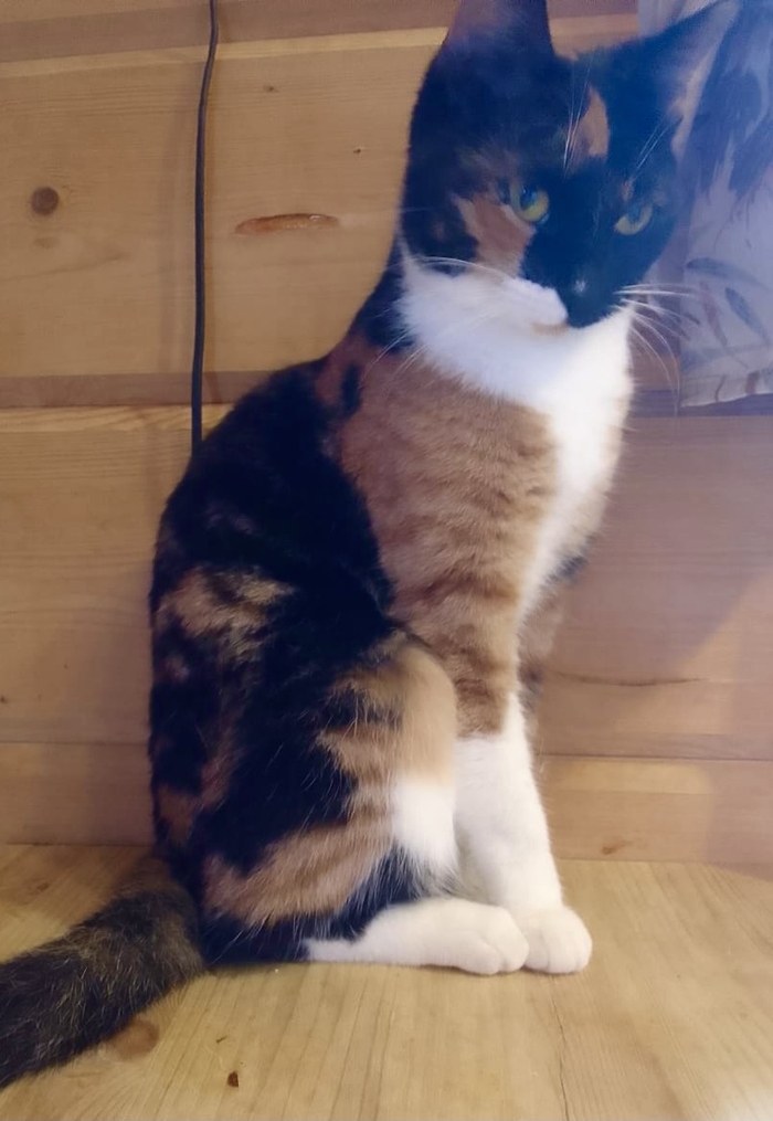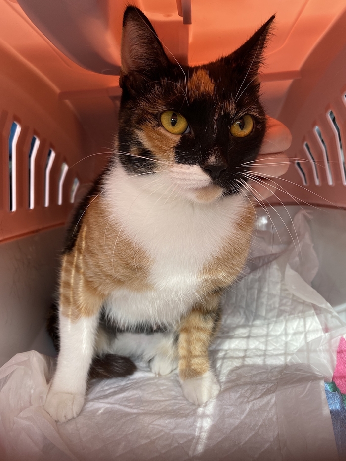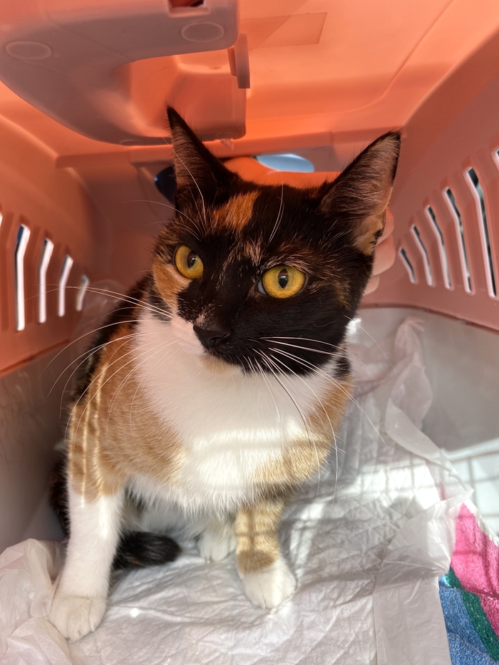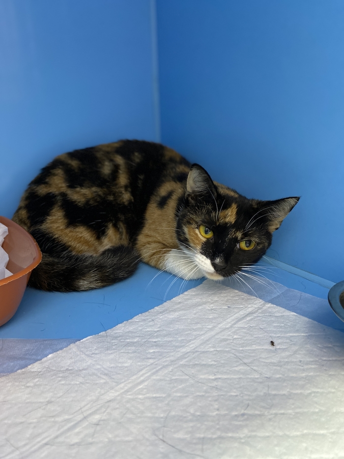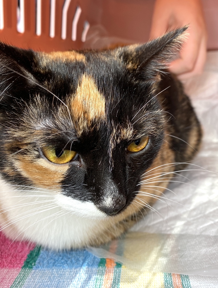Кошечка с рынка. 5 месяцев назад она там родила. Но котята не все выжили, так как на рынке опасно. Поэтому кошку и оставшихся котят забрала в клинику. Котята уже пристроены. А мама всё никак(