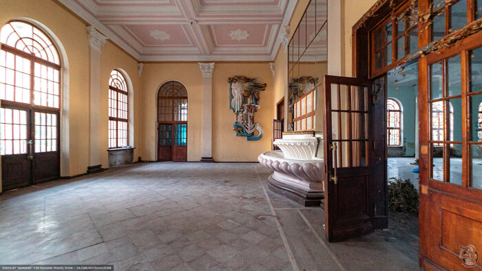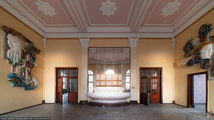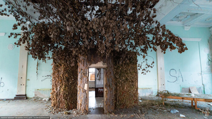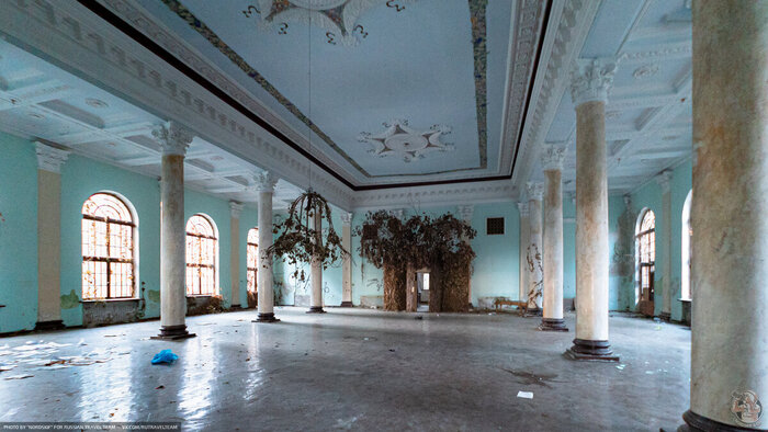 Даже в состоянии разрухи, главный зал столовой поражает убранством: добротный паркет, колонны, лепнина и роспись на потолках. Вот только вместо люстры висит высохшее дерево, а стены щедры исписаны бранным словом — мародёрам и граффитистам, чуждо любое проявление красоты.