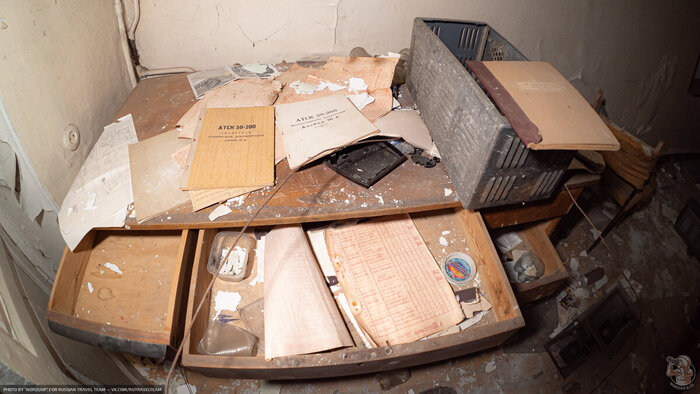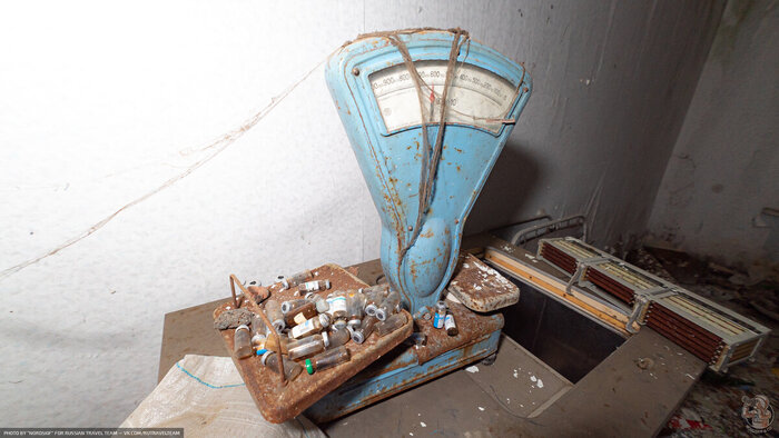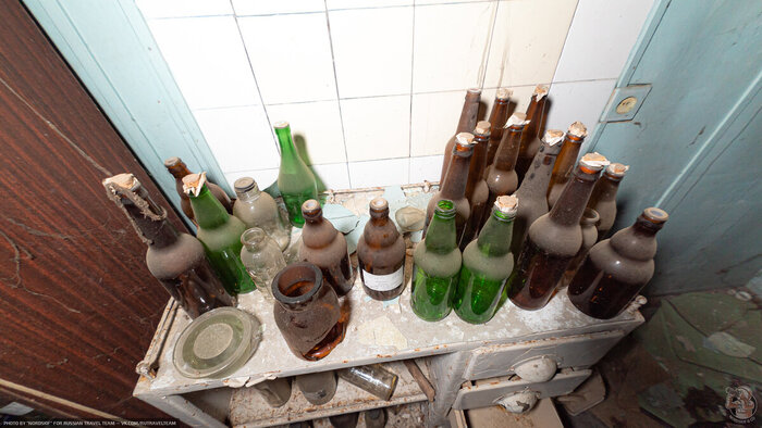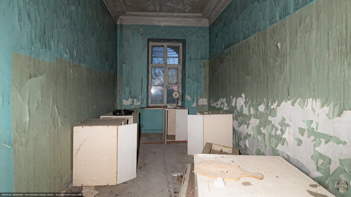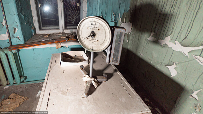 Часть заброшенного здания занимают медицинские кабинеты и склады: залежи банок, склянок и остатки медицинских приборов лежат на полках ветхих шкафов в комнатах с отслаивающейся краской.