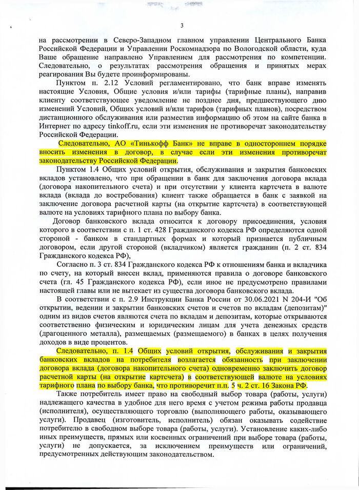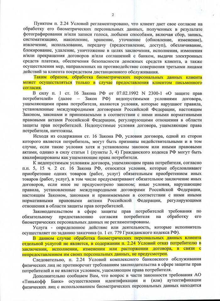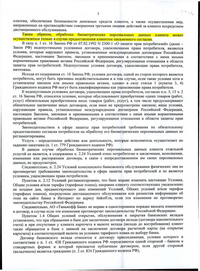 Таким образом Роспотребнадзор признал, что пункт 1.4 Общих условий открытия, обслуживания и закрытия банковских вкладов УКБО Тинькофф про подпункт 5 части 2 статьи 16 Закона РФ (Закона о Защите Прав Потребителей)