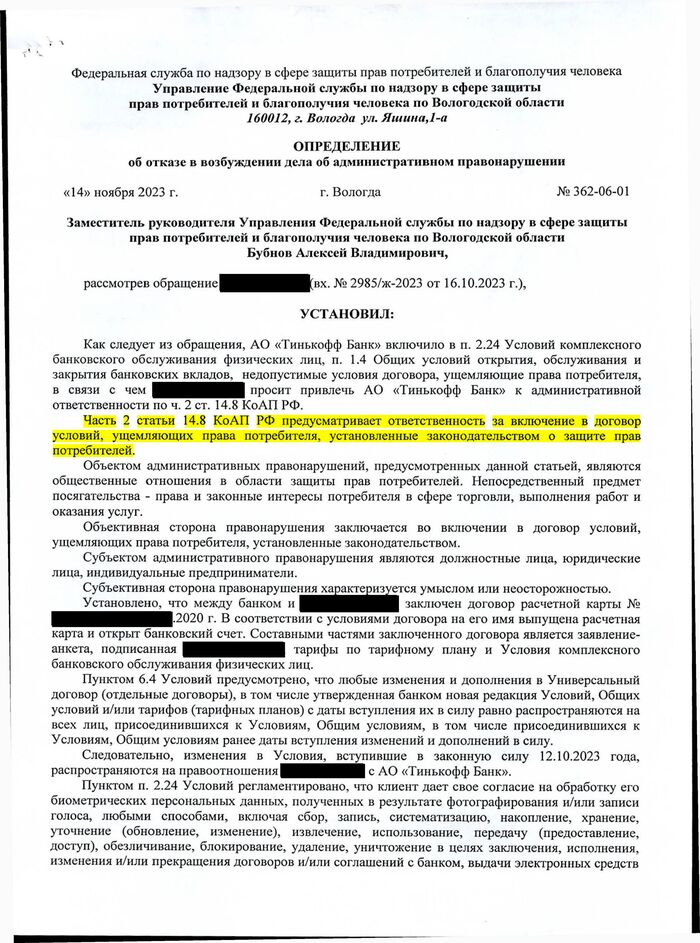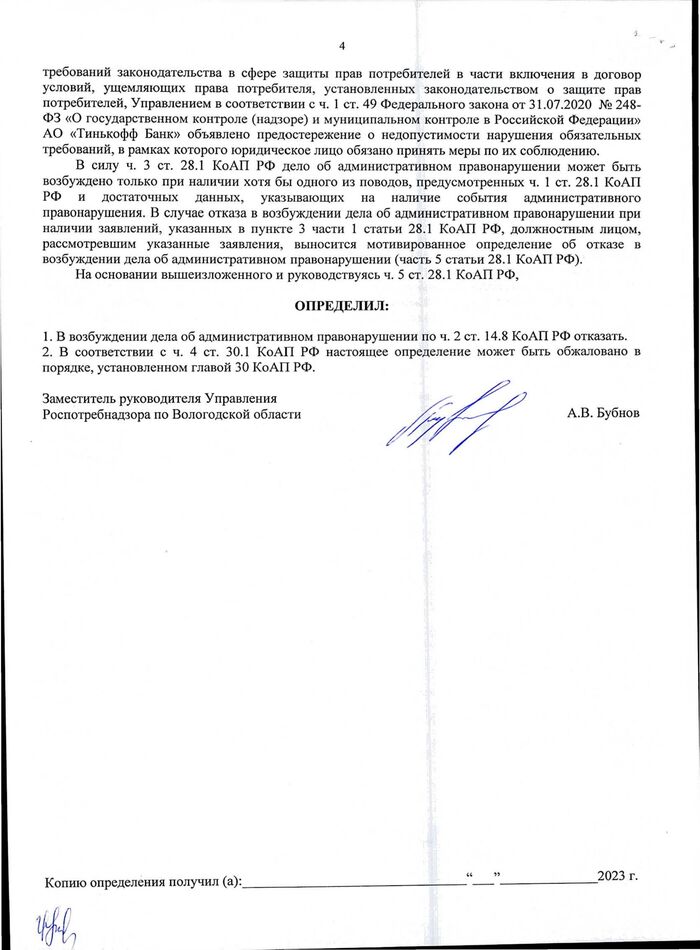 В связи с этим, со своей стороны я обжалую ответ Роспотребнадзора вышестоящему руководителю, лишь в части отказа в возбуждении административного дела и буду добиваться привлечение Тинькофф к административной ответственности за массовое нарушение прав потребителей финансовых услуг