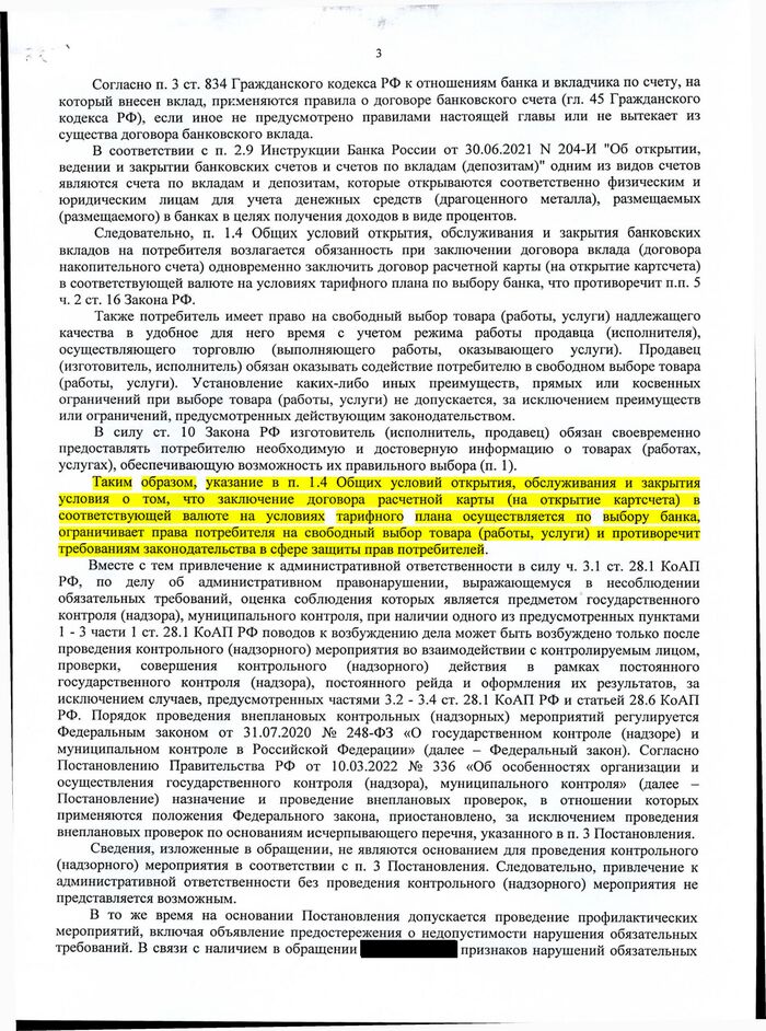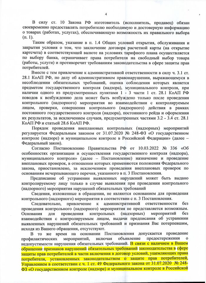 В связи с наличием в Вашем обращении признаков нарушений обязательных требований законодательства в сфере защиты прав потребителей в части включения в договор условий, ущемляющих права потребителя, установленных законодательством о защите прав потребителей,Управлением в соответствии с ч. 1 ст. 49 Федерального закона от 31.07.2020 No 248-ФЗ «О государственном контроле (надзоре) и муниципальном контроле в Российской Федерации» АО «Тинькофф Банк» объявлено предостережение о недопустимости нарушения обязательных требований, в рамках которого юридическое лицо обязано принять меры по их соблюдению