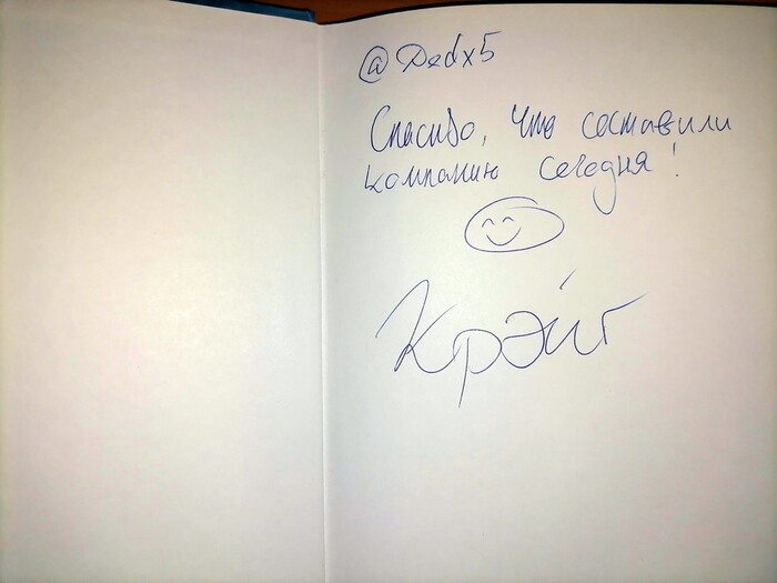 Следующий этап встречи - автограф-сессия. Одними автографами дело, конечно не ограничилось. Вопросы на русском и на английском, подарки Крейгу, фото с Крейгом, селфи с Крейгом и т.д. и т.п.