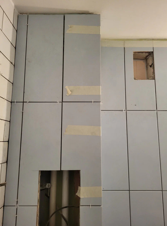 Посреди выложенной стены плитка вспучилась и легким движением руки мастера была отковыряна от стены. Как выяснилось в процессе, предыдущий мастер просто не прогрунтовал часть стены. Глаза мастеров потухли, как и наши. Поскольку мы не могли точно знать где предыдущий мастер не прогрунтовал стену, впереди нас ждал демонтаж положенной плитки, повторные выравнивание и грунтовка.
