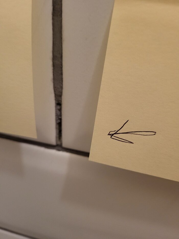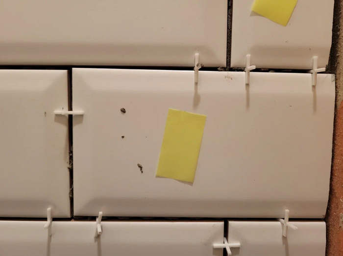 Стикерами помечали кривую плитку — без нас проблем работники не замечали. И они перекладывали и перекладывали… разгадка оказалась в использовании разных крестиков (или не использовании их вовсе).