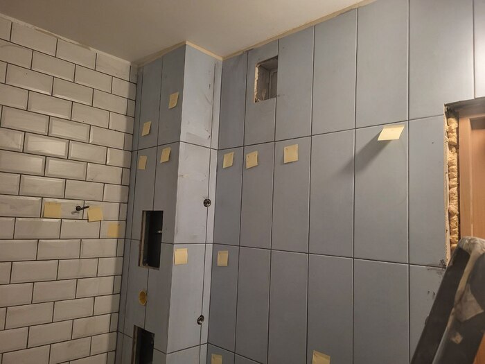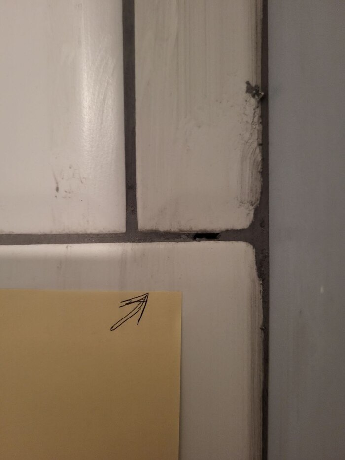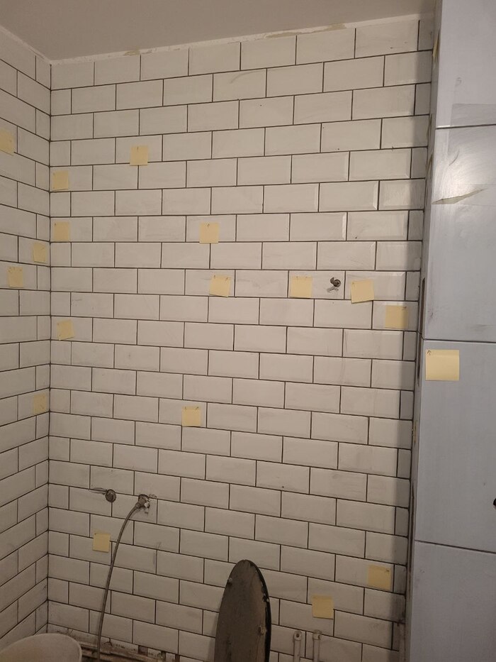 Когда плитка на стены была уложена, наступило время затирки. Плитку затерли с кучей пробелов и дыр. Уходя, мастер сказал: “ну вы если найдете какие-то косяки - отметьте на плитке”. Мы отметили.