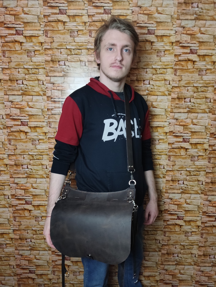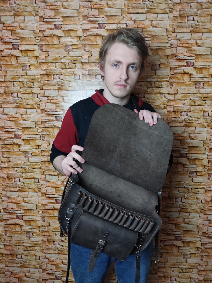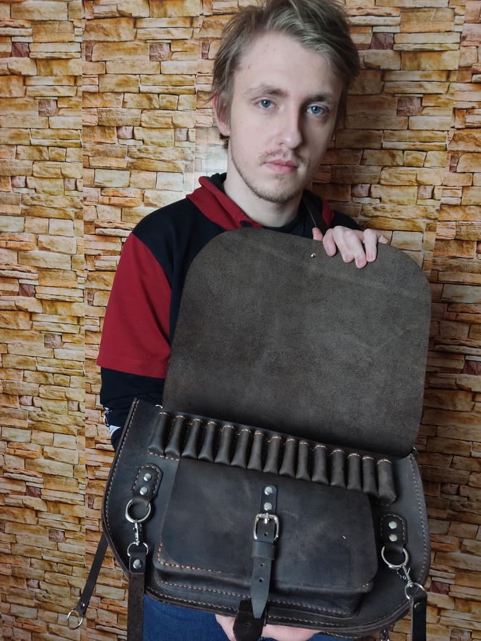 Сказал, что с такими вещами нужно фотографии с серьёзным лицом😁😁😁. Я очень долго смеялся. А он и правда был серьёзен. На сумке патронташ, шлейки для мелкой дичи. Сам не охотник, но всё по пожеланиям заказчика.