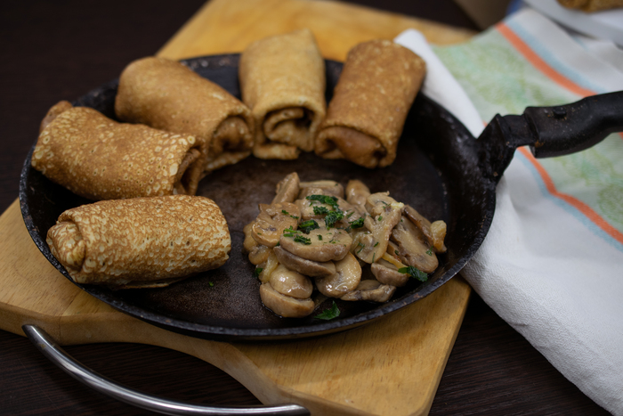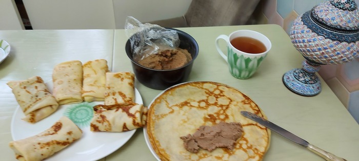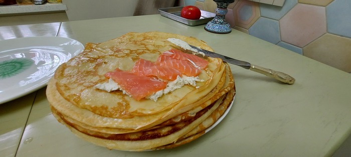 Укатила супруга в мастерскую проверить свежезалитые смолой столы. А тут что-то вспомнилось, что пора бы снять пробу с самодельной хреновухи. Ну, а закусить неплохо бы блинами, праздник как никак. Заодно поиздеваться над друзьями вкусной картинкой. Еще и исходный пост увидел, решил поделиться художеством. Вот в процессе фотографирования натюрморта, после всех приготовлений, супруга меня и застала. Сказала, что я деревенщина, пить в одно лицо, да ещё и из трёшки (лень переливать), и приказала достать ей черносмородиновую настойку и вторую рюмку. Вот теперь картинка полная ) Встречайте масленицу правильно!