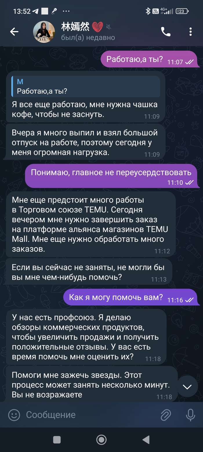 Она до этого рассказывала,что имеет бизнес онлайн магазина одежды,что так усердно работает каждый день ,чтобы заработать много денег и вместе со своей второй половинкой ездить за границу и далее зарабатывать на пару.Потом она решила рассказать,что помогла своей подруге подзаработать денег,что она ее угощает вином за помощь в заработке денег и что они уходят на вечеринку,начала включать в разговор название онлайн магазина TEMU. Тут я уже начал понимать,что всё идёт в правильном направлении,ведь до этого она никогда не упоминала про магазин.