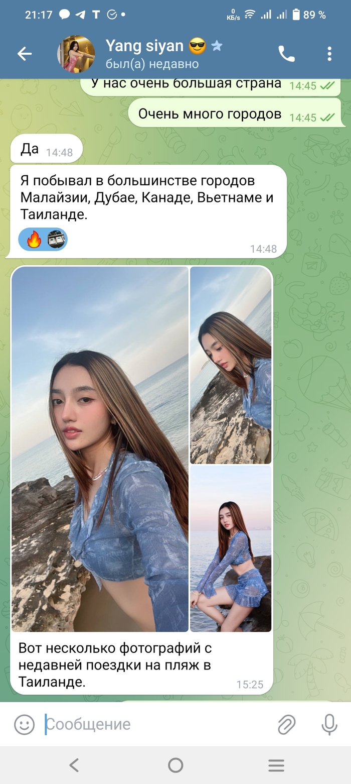 Недавно сижу я в телеграмме и приходит ко мне сообщение не английском языке от китаянки,мне стало даже интересно,она решила узнать у меня Елена я или она ошиблась номером телефона. На этот момент я,конечно,удивился,как она вообще могла выйти на российский номер телефона. Но все же я вежливо ответил что нет и закончил на этом разговор. Незнакомка китайского происхождения всё-таки решила продолжить со мной общение и начала меня расспрашивать как зовут,чем занимаюсь,с какого Я города и так далее,скинула личное фото и попросила перейти в её личный контакт,Я перешёл и ради интереса продолжил общение. В душе я понимал,что происходит какая-то ерунда и было интересно куда приведет это все.