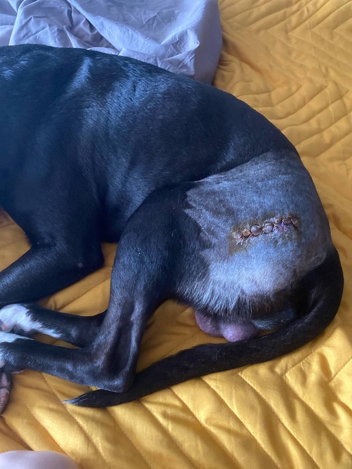 Около недели после операции, ситуацию спасает только два воротника, он быстро научился их заламывать и разлизывать шов. Это очень и очень плохо. После TPLO мы раз проспали момент, и пришлось накладывать еще одни швы, лечение увеличилось еще на 4 дня уколов и неделю со швами. Тут же все было четко и через две недели швы сняли.