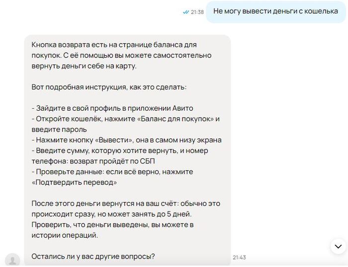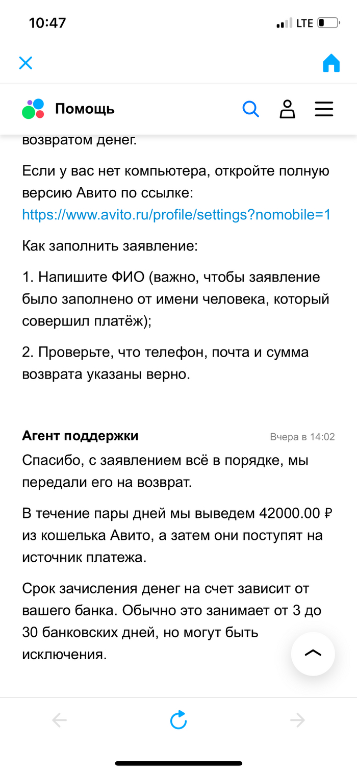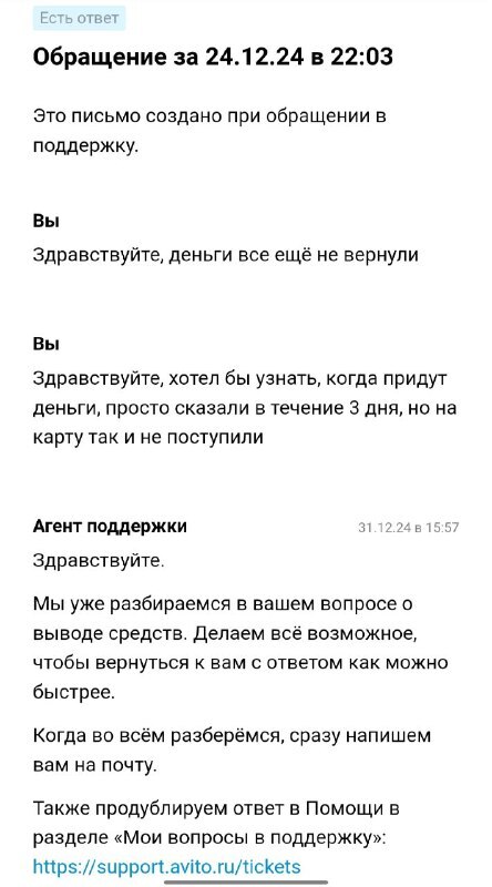 26.12.24 служба поддержки «Авито» приняла мое заявление (после двух неудачных). В этот же день мне написали, что они начали процесс возврата по этому заявлению. Вчера мне написали, что мое возвращение по возврату ещё в работе и что меня оповестят, как только выведут деньги (39 тысяч) из «Авито»-кошелька. Но, как понимаете, до сих пор не оповестили (хотя моё обращение явно проверили, и что подразумевается под «Процесс возврата ещё в работе» не совсем ясно, ведь нужно всего лишь отправить деньги на мою карту, с которой я пополнял кошелёк «Авито»). То, что от меня требовалось, я выполнил, теперь черед «Авито». Я скинул не 400 рублей, чтобы так просто забить. И я не собираюсь опускать руки. Скажите своим коллегам, чтобы они вернули МОИ деньги с кошелька на мою банковскую карту.К сведению прошло 23 дня,а мне так и не помогли, лишь кормят обещаниями и лапшу на уши вешают.
