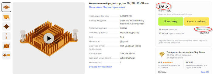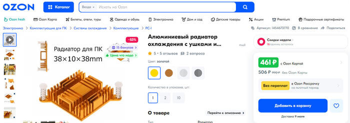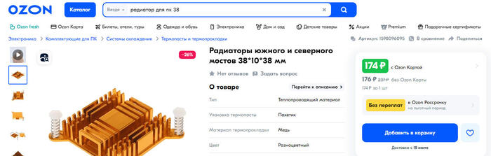 Как-то был озадачен покупкой радиатора, для нетипового чипсета. В числе первых попался вариант одного продавца на понятно каком маркетплейсе (Озон). В общем подумал ещё дороговато, но заказал.