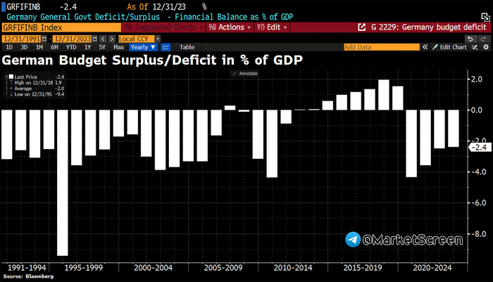 Смотрите, дорогие друзья, перед вами график бюджетных дефицитов европейского локомотива - Германии.