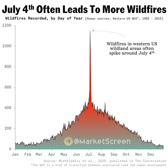 Исследование, проведенное в 2020 году Миткевичем и соавторами, первоначально опубликованное в The Conversation, показало, что количество лесных пожаров, вызванных деятельностью человека, резко возрастает в дни, приближающиеся к 4 июля, что в значительной степени объясняется широким использованием фейерверков во время праздника. Этот регулярный всплеск обостряет существовавшую ранее проблему антропогенных лесных пожаров в США. Согласно данным, приведённым Службой национальных парков, почти 85% лесных пожаров, возникших в период с 2000 по 2017 год, были вызваны людьми.