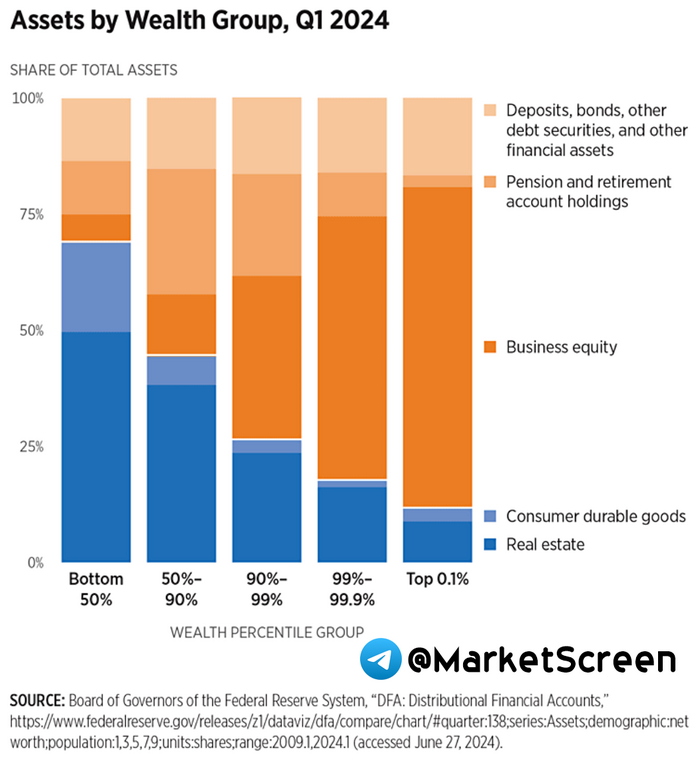 Смотрите, как интересно получается. Если мы разделим общество на страты перцентили по доходам, то увидим, что у 0,1% самых богатых граждан 88% активов связаны с бизнесом и производством. И лишь 9% приходится на недвижимость. И очень мало на потребительские товары длительного пользования, которые включают в себя стандартные предметы роскоши, такие как яхты, ювелирные изделия, автомобили.