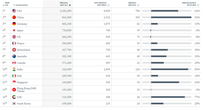 Понятно, лидером являются США. Там на декабрь 2023 было обнаружено 5 492 400 миллионеров, 9 850 юнитов с активами от 100кк$ и 788 миллиардеров. Дальше идут Китай, Германия, Япония.