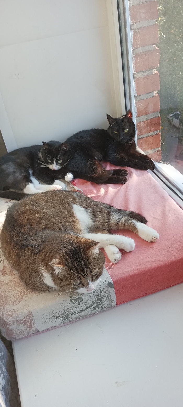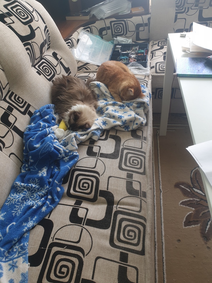 Тиша и Тася вместе. У Таси на лапка капельница. Она тогда заболела и мы потащили её лечить. Очень беспокоились.