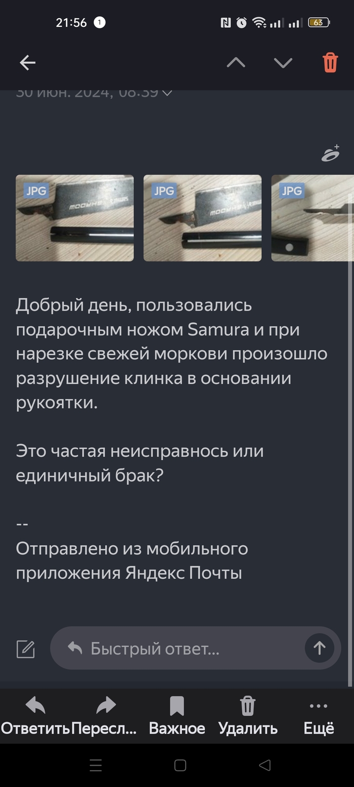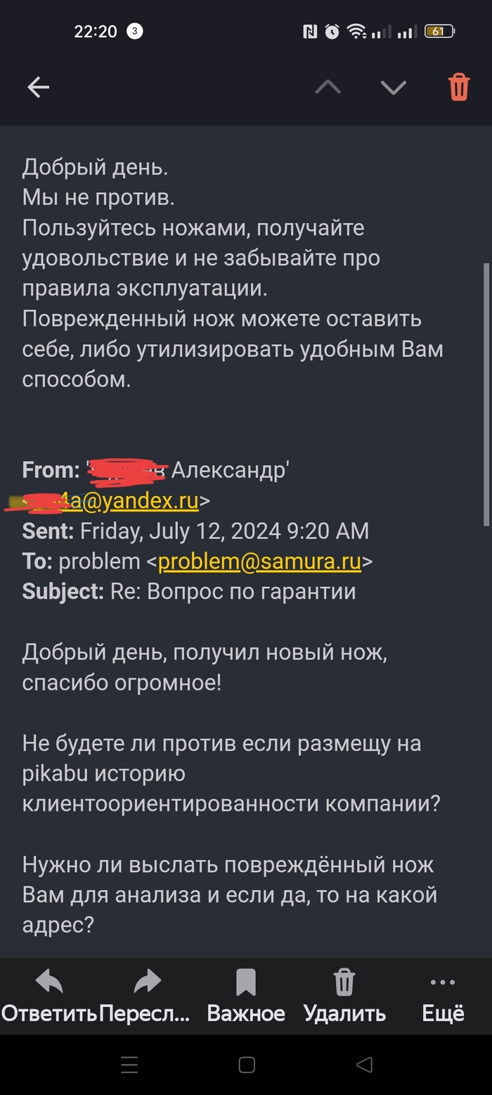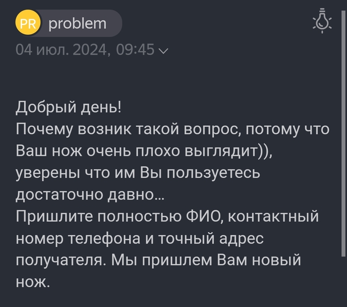 Производитель дал согласие и прислал памятку по уходу за новым ножом. Со своей стороны предложил отправить старый нож для исследования, но производитель отказался.