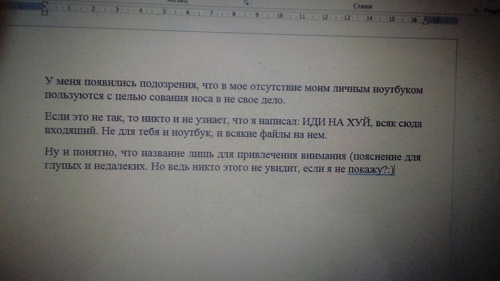 А я притащил свой недобук на работу, потому что служебный комп сгорел в грозу. Начальница в разговоре проболталась, что читала личный файл на ноуте. Отсюда родилось это: