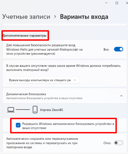 Затем откройте Варианты входа и докрутите скроллинг до Динамическая блокировка.