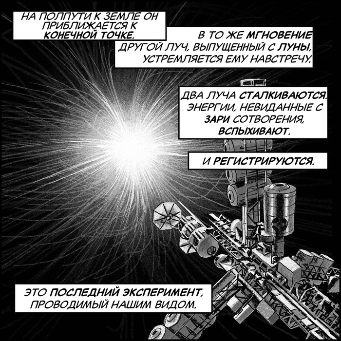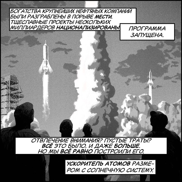 Достигшее вершин киборгизации и нейронной связи человечество решило провести объединение людей уже в единое сверхсущество. Но попытки совершить это на малых группах людей не удались, оказалось что электрического контакта нервных систем не достаточно для объединения. Теоретические расчёты показали, что объединение возможно при полном слиянии мыслящих структур на самом базовом физическом уровне. Усовершенствовать же технологии можно было лишь после получения фундаментальных физических знаний, недоступных без постройки ускорителя космических масштабов. Застой в фундаментальной физике длился уже десятилетия и других решений не предвиделось. Было принято решение начать строительство: люди нового времени умели ждать.