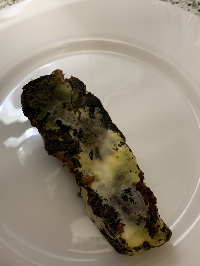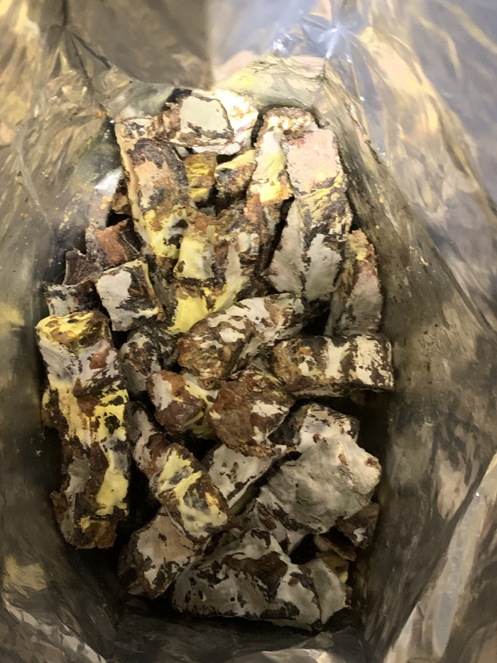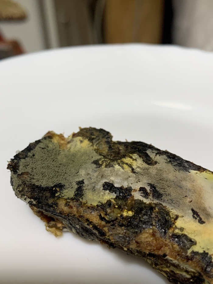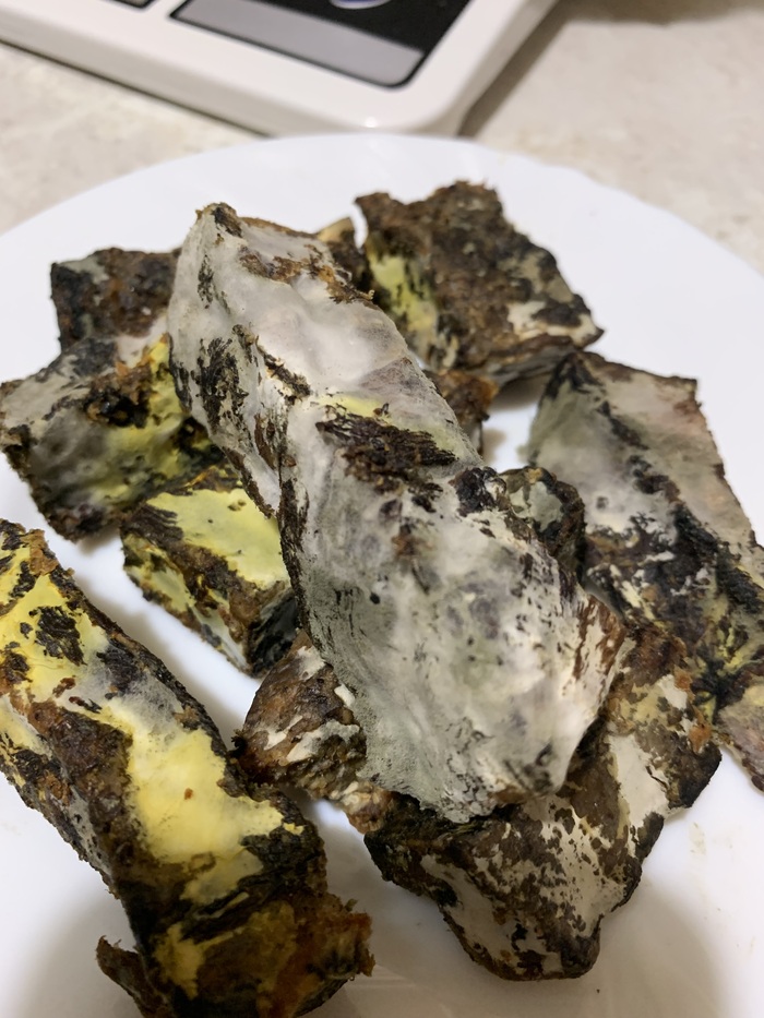 Буду ли я оправдываться? Нет! Реально одна загрузка сушилки оказалась вот такой, хотя сушили ее двое суток или даже 36 часов. Обычно 18 и готово, а тут... Не знаю, может из-за того что температура на улице была минус 20 и сушилка больше воздух грела с -20 до +65, а не мясо. В общем вышло как вышло. Скажу честно, влажное мясо я не запихивал в пакет, понимаю чем это закончится. Закрытое герметичное пространство, тепло и естественно пойдёт плесень. Может из-за того что был минус и влага замерзла и я не почувствовал, хрен знает, теперь уже поздно искать причину.