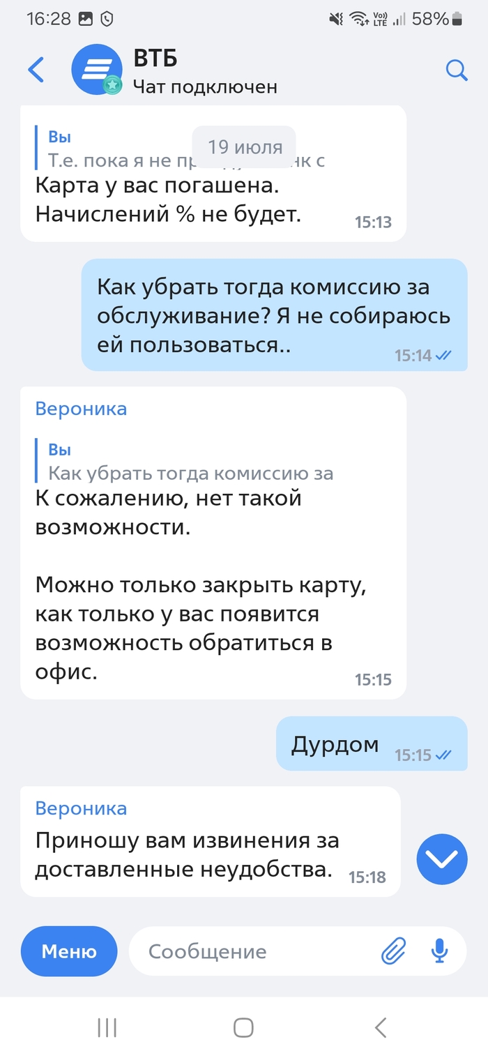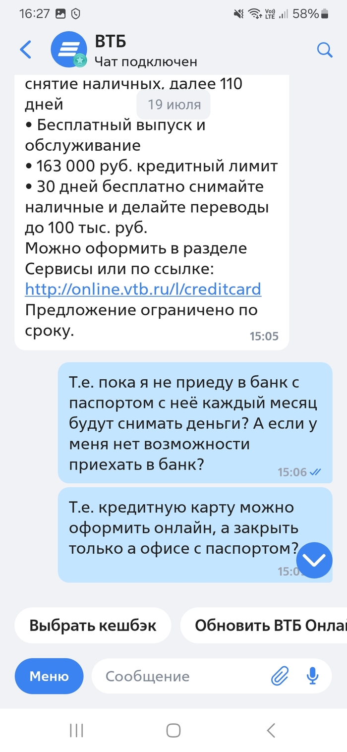 Была у меня тут не так давно кредитная карта ВТБ, попользовалась около года и полностью погасила, нажала кнопку закрыть счет(или что-то вроде этого)и благополучно забыла про нее... И что-то дернуло меня глянуть в приложение спустя пару месяцев, а там красовалась та же самая карта только уже с минусом, ну я этот минус доложила и пишу в чат:
